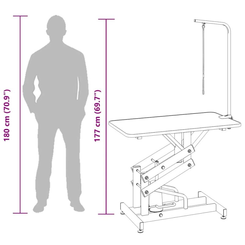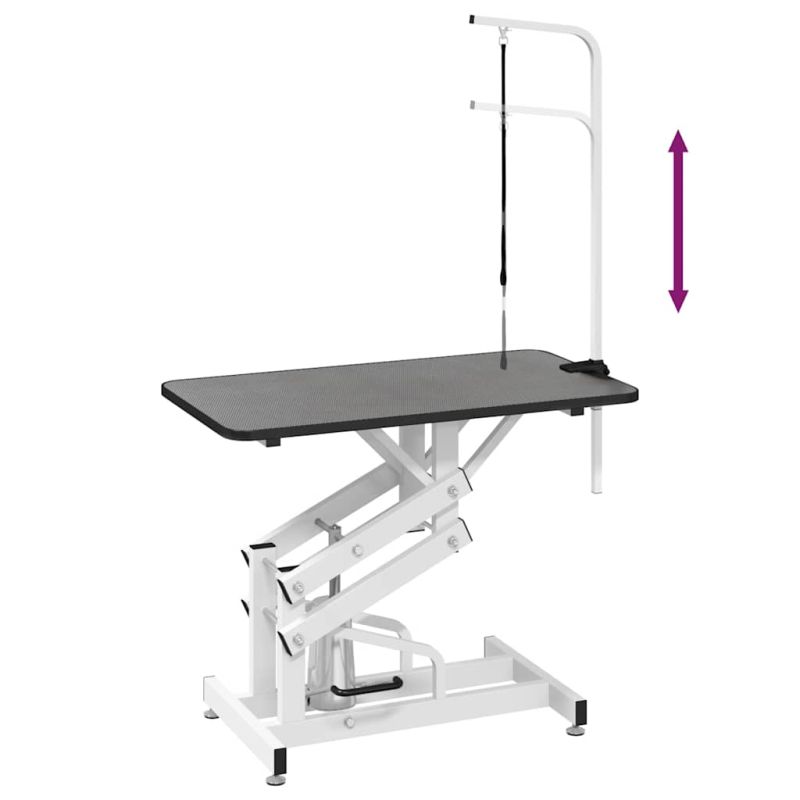 Тази маса за подстригване на домашни любимци е перфектна за домашни условия, но също така е лесно преносима. Отличава се с нехлъзгав плот и прахово боядисана метална рамка с регулируеми ръка и крак. Професионалната хидравлична грууминг маса ще донесе комфорт при използване. Плотът е с гумено покритие, за да предпази животните от подхлъзване, докато ги подстригвате или къпете. Също така здравата регулируема ръка се разглобява, когато не използвате масата, за по-лесно съхранение и транспорт. Хидравличният дизайн на крака позволява регулиране до желаната височина. Регулируемата примка спомага за безопасността на домашните любимци и се отличава с плъзгаща се закопчалка. Доставката включва 1 х маса за подстригване на домашни любимци, 1 х фиксираща регулируема ръка и 1 х примка.
