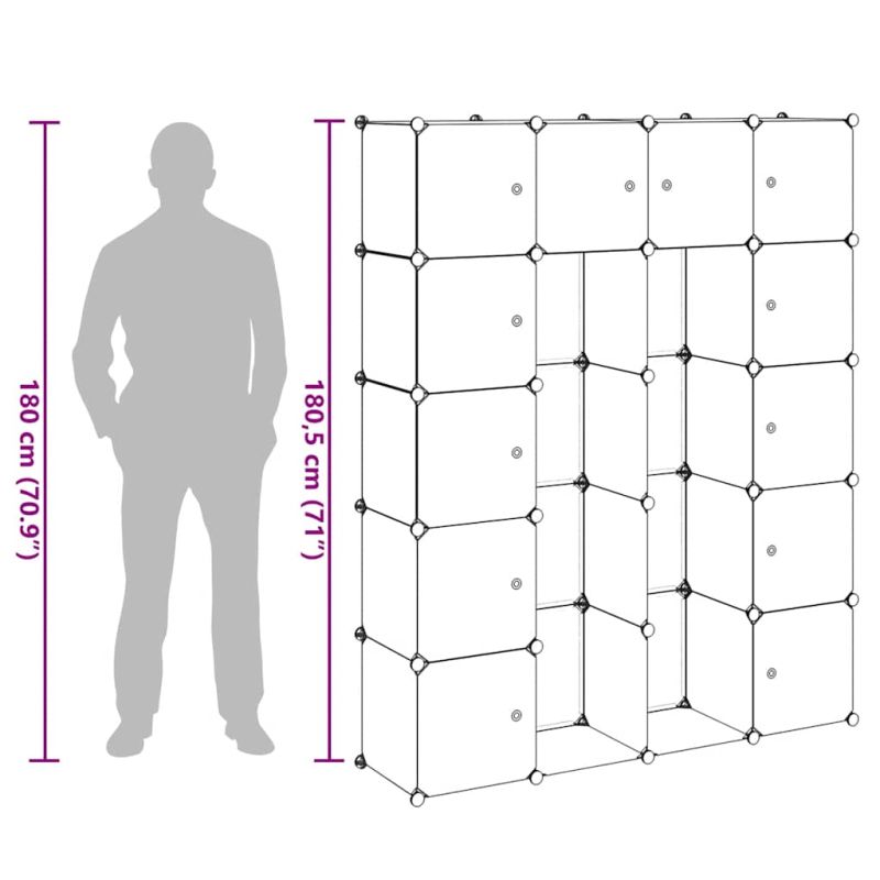 Този функционален модулен шкаф е не само много стилен, но ще поддържа вашите дрехи и обувки спретнато организирани. Ще бъде чудесно допълнение към вашата детска стая, всекидневна, коридор или спалня. Гардеробът е изработен от пластмасови елементи и хромирана стоманена тел, което го прави лесен за почистване. Благодарение на интелигентния си дизайн, шкафът може да се настрои бързо и лесно в различни конфигурации, според пространството или вашето настроение. Моля, избягвайте да натоварвате прекалено много рафтовете и имайте предвид, че пластмасата е запалима.