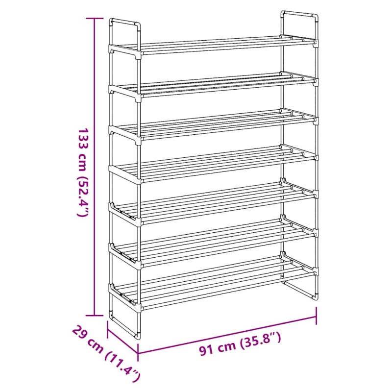 Този минималистичен стелаж за обувки е идеално решение за съхранение на обувките ви. Той има тръбна метална рамка, която е лека и здрава, правеща етажерката за обувки лесна за местене и доста издръжлива. Разполага със седем широки рафта, които са с достатъчно пространство, за да поддържате обувките си подредени. Сглобяването е лесно.