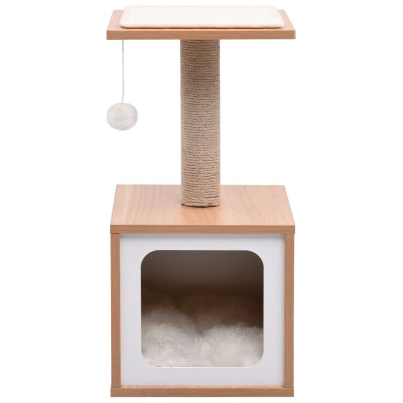 Върху тази красива котешка къща котките ви могат да драскат, да се крият, да се катерят и да си почиват до насита. Тя ще се впише във всеки интериор. Вашите котешки приятели могат да острят ноктите си върху стълба за драскане от юта, което осигурява здравословно решение за техните инстинкти за драскане. Основата на котешките мебели е здрава и стабилна. Те могат да се наслаждават на гоненицата, докато скачат нагоре - надолу по този забавен център за игра. Най-горната платформа е покрита с подвижна подложка от сизал. Когато свършат с игрите, вашите малки приятели ще се насладят на почивката върху нея с по-добър изглед от височината на тази платформа. А нашата кула за котки е проектирана с уютна къщичка, където вашата котка може да подремне. Удобната възглавница в къщата може да се пере. Включена е и висяща топка за допълнително забавление. Това котешко дърво се сглобява лесно.
