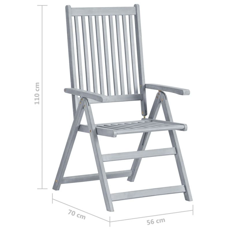 Този дървен комплект с накланящи се градински столове подобрява комфорта във вашето външно пространство! Тези кресла са изработени от масивна акациева дървесина със сиво покритие – твърда дървесина с плътни шарки. Тези красиво проектирани градински столове са стабилни, издръжливи и привличат вниманието. Облегалката на стола може да се регулира в 5 нива на наклон, така че винаги можете да си осигурите най-удобната позиция според вашите предпочитания. Тези столове са идеални за вечеря със семейството ви или просто да се насладите на времето във вашата градина. Максимално 110 кг на седалка.