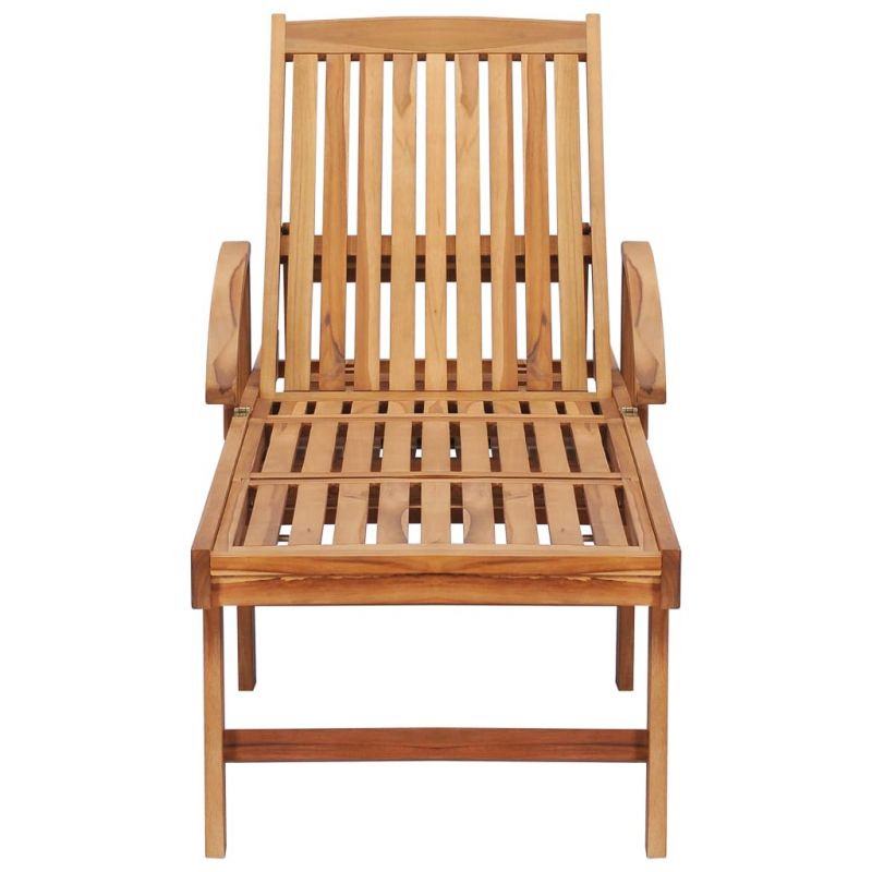 С този дървен шезлонг винаги ще разполагате с удобно място за почивка във вашия вътрешен двор или в градината си. Уникалната дървена структура е приветлива и излъчва естествен чар. Тази мебел от тик е изработена от изключително издръжлива тикова твърда дървесина, която е суха – изсушена в пещ, а след това фино шлифована, за да ѝ се придаде много гладък вид. Тиковото дърво е известно с изключителната си здравина и устойчивост на атмосферни влияния, което го прави далеч по-подходящо за градински мебели от всеки друг вид дърво. Тиковата дървесина е идеалният избор, ако искате да закупите дълготрайна градинска мебел. Снабден с 2 колелца, градинският шезлонг може лесно да се мести. Облегалката може да се регулира в 3 позиции – от седнало напълно изправено до напълно легнало положение. Опората за крака също е регулируема за допълнителен комфорт. Ламелите на седалката и облегалката предлагат отлична опора и също така комфорт, а двата подлакътника осигуряват място за почивка на ръцете ви. В допълнение, страничната маса ви позволява да поставите вашите телефони, слънчеви очила, напитки, както и други дребни предмети на леснодостъпно място. Включената възглавница е повече от практично допълнение; тя има и декоративна функция. Забележка: За да удължите живота на вашите градински мебели, ви препоръчваме да ги защитите с водоустойчиво покривало.