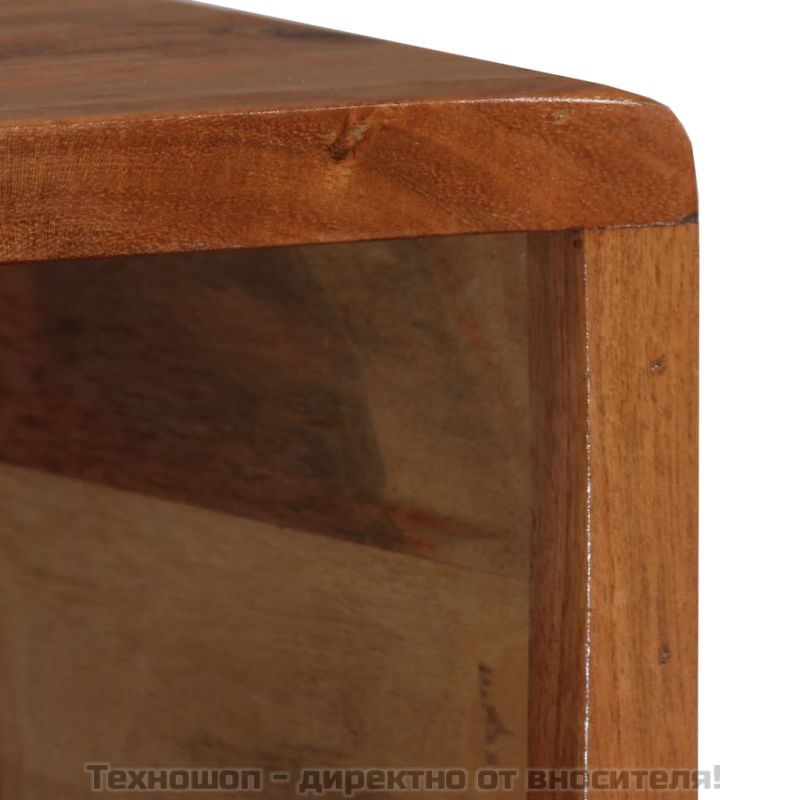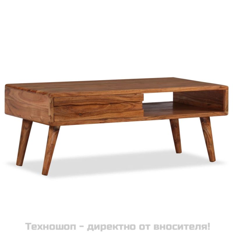 Дървената кафе маса излъчва рустик чар е чудесно допълнение към вашия интериор. Масата за кафе е изработена от акациева дървесина масив с красив финиш, постигнат чрез полиране, боядисване и лакиране, които ѝ придават изискан вид. Тази маса е изцяло ръчна изработка, а красивите дървени шарки правят всяка мебел уникална и малко по-различна. Тази странична маса има здрава и стабилна повърхност, върху която можете да поставите напитки, храни, купи с плодове или декоративни елементи. Тази масичка за кафе разполага с резбовано чекмедже и отделение, които осигуряват достатъчно място за съхраняване на вашите списания, книги, дистанционно управление и други дребни предмети. Монтажът ѝ е лесен. Важна забележка: Цветовете варират от парче до парче, което прави всяко парче уникално. Доставката е на случаен принцип, което гарантира ексклузивността и индивидуалността на вашия продукт.