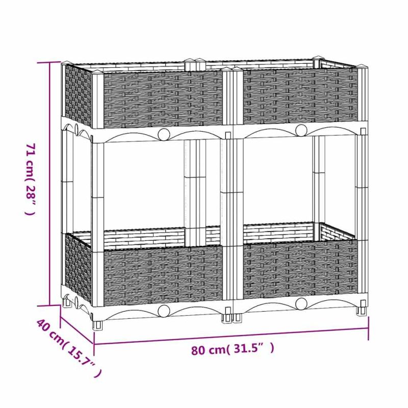 Тази повдигната леха ще бъде отлично решение за любители градинари, които искат да украсят своите градини, балкони или вътрешни дворове. Този плантер, снабден с 2 рафта, е изработен от полипропилен, което го прави здрав, износоустойчив и подходящ за ежедневна употреба на открито. Градинската леха е достатъчно дълбока и широка, за да побере голямо количество пръст и осигурява достатъчно място за вашите растения, зеленчуци, билки и цветя. Създайте прекрасен фон за вашите растения с тази елегантна леха за засаждане!