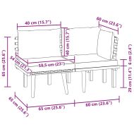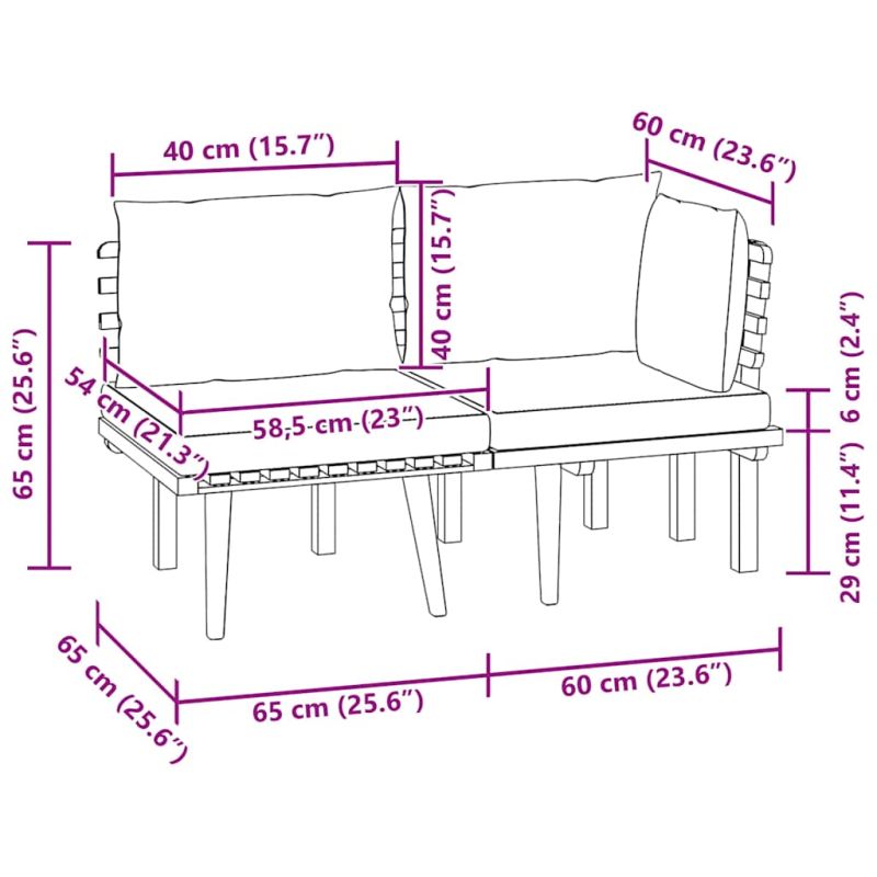 Този градински лаундж комплект е отличен избор за релакс и наслада на времето, за дрямка или разговори със семейството или приятелите ви. Дървеният лаундж комплект с неостаряващ дизайн от палети добавя нотка на рустик чар към вашия вътрешен двор, тераса или градина. Изработен от масивно акациево дърво, комплектът градински мебели е устойчив на атмосферни влияния и много издръжлив. Комбиниран с дебело подплатени възглавници, този лаундж комплект за вътрешен двор осигурява оптимален комфорт. Можете да го съчетаете с други модулни сегменти, за да създадете ваши собствени конфигурации на градински лаундж комплект! Забележка: За да удължите живота на вашите градински мебели, препоръчваме ви да ги почиствате редовно и да не ги оставяте ненужно на открито без защита.Почистване: Използвайте мек сапунен разтворСъхранение: Ако е възможно, съхранявайте на хладно и сухо място на закрито. Ако продуктът се съхранява на открито, защитете го с водоустойчиво покривало. Избършете и изсушете излишната вода или сняг от плоските повърхности след дъжд или снеговалеж. Осигурете достатъчно циркулация на въздух, за да избегнете повреди, свързани с влагата.