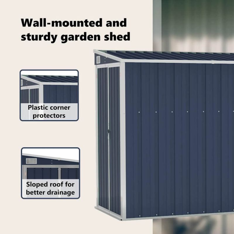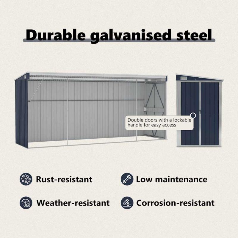 Разширете възможностите си за съхранение на открито и защитете инструментите си с този стенен градински навес. Здрав материал: Тъй като е изработен от поцинкована стомана и метал, складът изисква минимална поддръжка и е много издръжлив. Голямо пространство за съхранение: Този стенен градински навес е идеален за съхранение на различни предмети като инструменти, градински мебели, градинско оборудване и др. Навесът предлага защита от мръсотия, прах, както и от силен вятър и атмосферни влияния.Практичен дизайн: Двойно отварящите се врати отпред позволяват лесно влизане и излизане. Пластмасовата дръжка с функция за заключване гарантира безопасността на вашите вещи. Освен това, дъждовната вода се оттича автоматично от покрива благодарение на наклонения си дизайн.Полезно е да знаете:За да предотвратите повреди от обилно натрупване на сняг, препоръчваме редовно почистване на покрива през зимата.