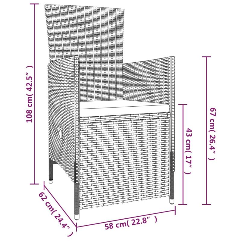 Този стилен комплект градински трапезни мебели е предназначен да се превърне във фокусна точка на вашата градина или вътрешен двор! Той е чудесен избор за вечеря или релакс на открито! Прахово боядисаната стоманена рамка прави масата и столовете здрави и стабилни за ежедневна употреба на открито. Благодарение на водоустойчивия PE ратан, столовете са лесни за почистване и издръжливи. Облегалката и поставката за крака могат да се регулират с дърпане на бутона от едната страна. Благодарение на леката конструкция, те са лесни за преместване. Дебело подплатените възглавници на седалката също добавят допълнителен комфорт. Лесните за поддръжка полиестерни калъфи могат да се свалят и изперат. Освен това гладкият стъклен плот е лесен за почистване с влажна кърпа и перфектен за поставяне на храна, напитки и декоративни предмети. Забележка: За да удължите живота на вашите градински мебели, препоръчваме ви да ги почиствате редовно и да не ги оставяте ненужно на открито без защита.Почистване: Използвайте мек сапунен разтвор.Съхранение: Ако е възможно, съхранявайте на хладно и сухо място на закрито. Ако продуктът се съхранява на открито, защитете го с водоустойчиво покривало. Избършете и изсушете излишната вода или сняг от плоските повърхности след дъжд или снеговалеж. Осигурете достатъчно циркулация на въздух, за да избегнете повреди, свързани с влагата.