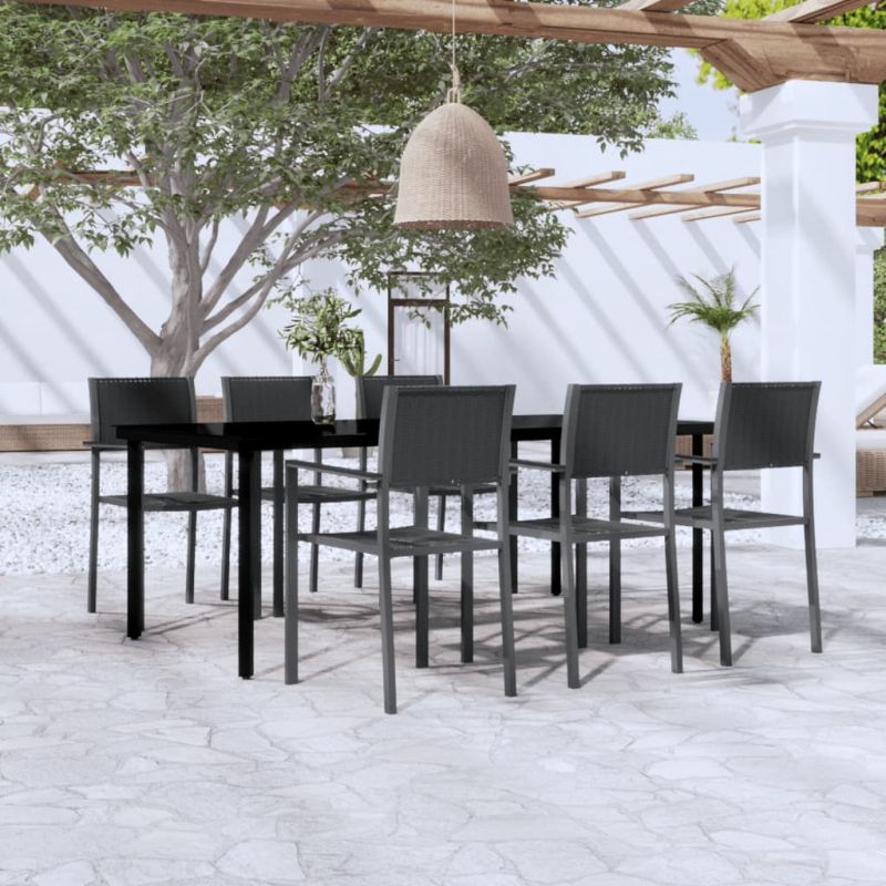 Този трапезен комплект за открито е перфектна комбинация от стил и функционалност и е предназначен да бъде фокусната точка на вашата градина, тераса или вътрешен двор. Този комплект патио мебели е изработен от прахово боядисана стоманена рамка, което го прави здрав и стабилен за ежедневна употреба на открито. Гладкият стъклен плот се почиства лесно с влажна кърпа и е идеален за поставяне на ястия, напитки и различни декоративни предмети. Леките градински трапезни столове са изработени от пластмаса, което ги прави лесни за почистване и преместване. Градинските трапезни столове с ратанов дизайн добавят нотка на естествен чар към вашето външно жилищно пространство! Забележка: За да удължите живота на вашите градински мебели, ви препоръчваме да ги защитите с водоустойчиво покритие.