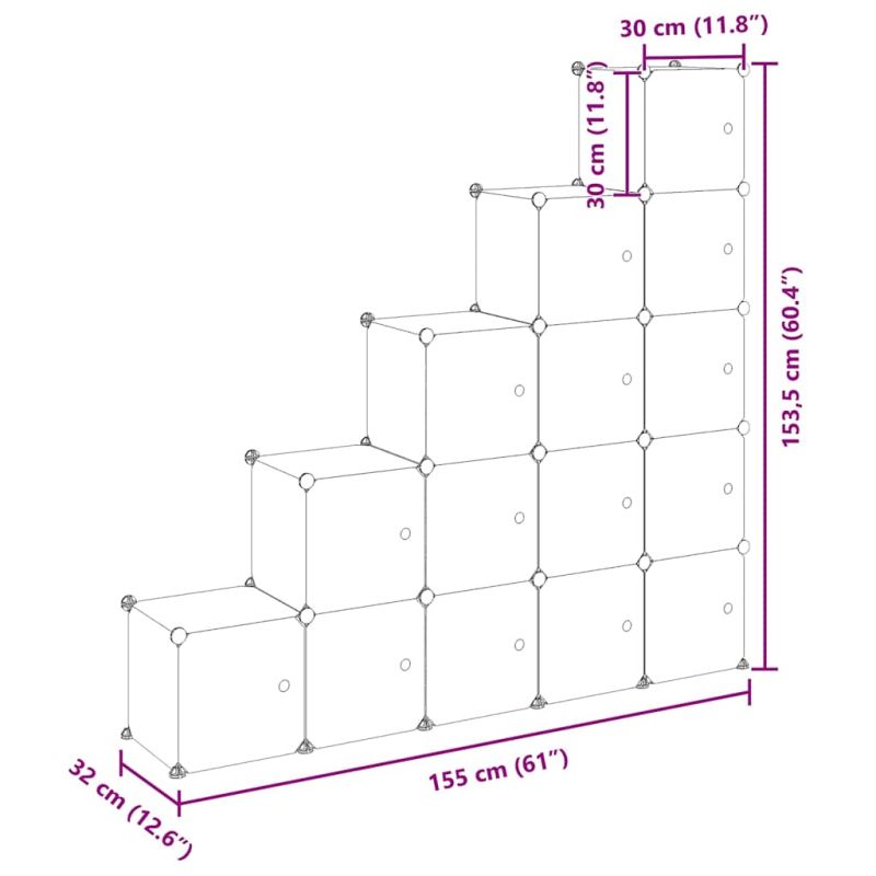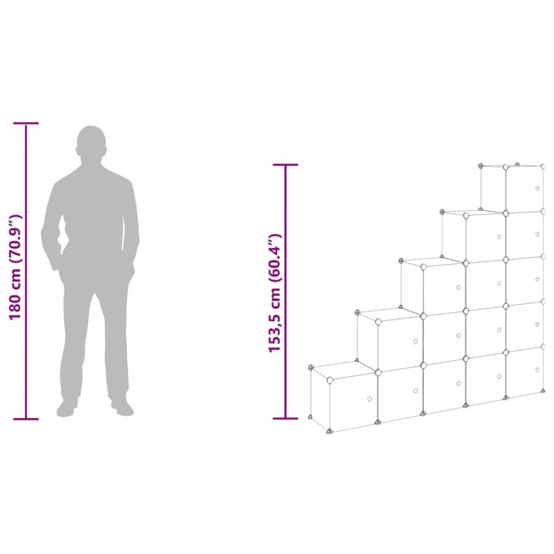 Този универсален органайзер за съхранение тип куб е предназначен да използва максимално ограниченото пространство и да задоволи разнообразните ви нужди за съхранение. Практичен материал: Органайзерът за съхранение е изработен от PP пластмасови панели, които са водоустойчиви и изискват лесна поддръжка.Здрава и стабилна конструкция: Стоманените рамки осигуряват здравина и стабилност.Лесен за употреба дизайн: Благодарение на лекия дизайн, рафтът за съхранение може да се сглоби по ваш вкус с включения дървен чук. Когато не се използва, панелите лесно се разделят и подреждат, за да се спести място.Достатъчно място за съхранение: Този пластмасов гардероб съдържа 15 модулни куба. Пространството за съхранение улеснява организирането на нещата.Широки приложения: С голямо пространство за съхранение и семпъл дизайн, стелажът за съхранение е отлично решение за вашия дом, общежитие и офис. Забележка:Максималният товароносимост на всеки куб е 10 кг.