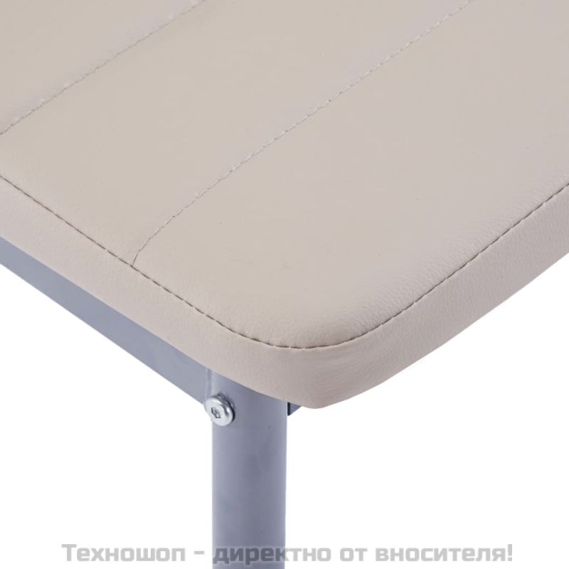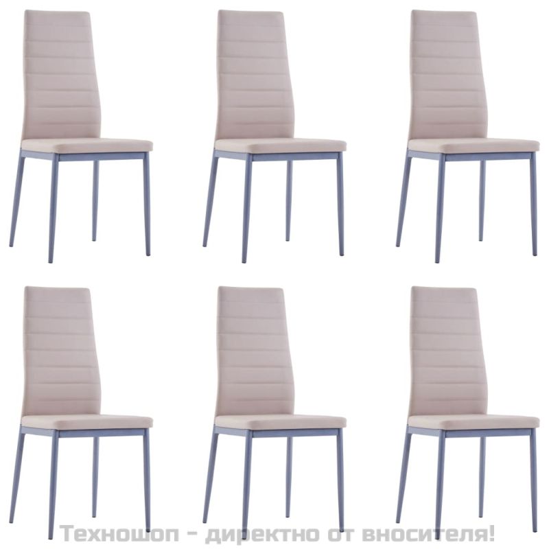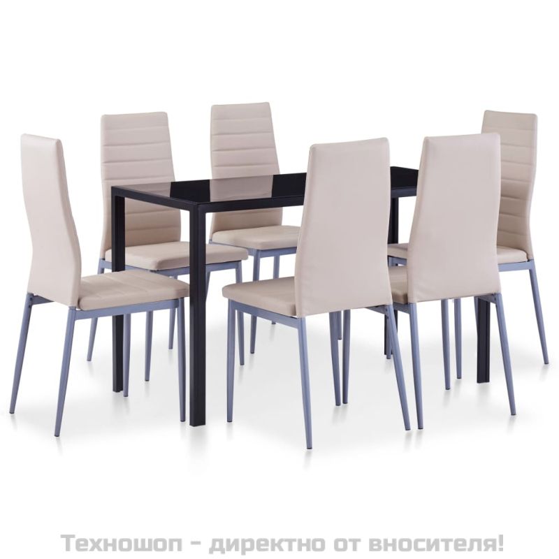 Този трапезен комплект, състоящ се от 7 части, има елегантен, модерен дизайн и е идеален за тези, които търсят да добавят стилно докосване към своя интериор. Масата е изработена от високоякостно темперирано стъкло, което се почиства лесно. Всеки стол е тапициран с качествена изкуствена кожа. Меката, подплатена седалка е много удобна. Доставката включва 1 маса и 6 стола.