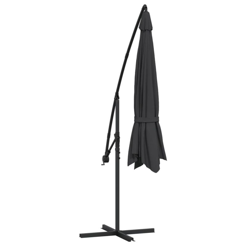 Този елегантен висящ градински чадър е перфектно решение за създаване на сянка, с което да се предпазите от вредните UV лъчи на слънцето. Изработено от неизбледняващ полиестер, предпазващ от ултравиолетовите лъчи, покривалото на чадъра осигурява оптимална защита срещу слънцето и се почиства лесно. Той разполага с кръстата основа за допълнителна стабилност. Изключителният дизайн на този чадър ви позволява да наклоните чадъра, за да блокирате слънцето, докато то се отправя към хоризонта. Здравият метален прът и 8-те издръжливи спици правят чадъра много стабилен и устойчив. Нашият градински чадър се отваря и затваря удобно, благодарение на манивелата. Артикулът се сглобява лесно. Моля, забележете, че препоръчваме обработката на текстила на чадъра с хидроизолационен спрей, ако е подложен на силни валежи.