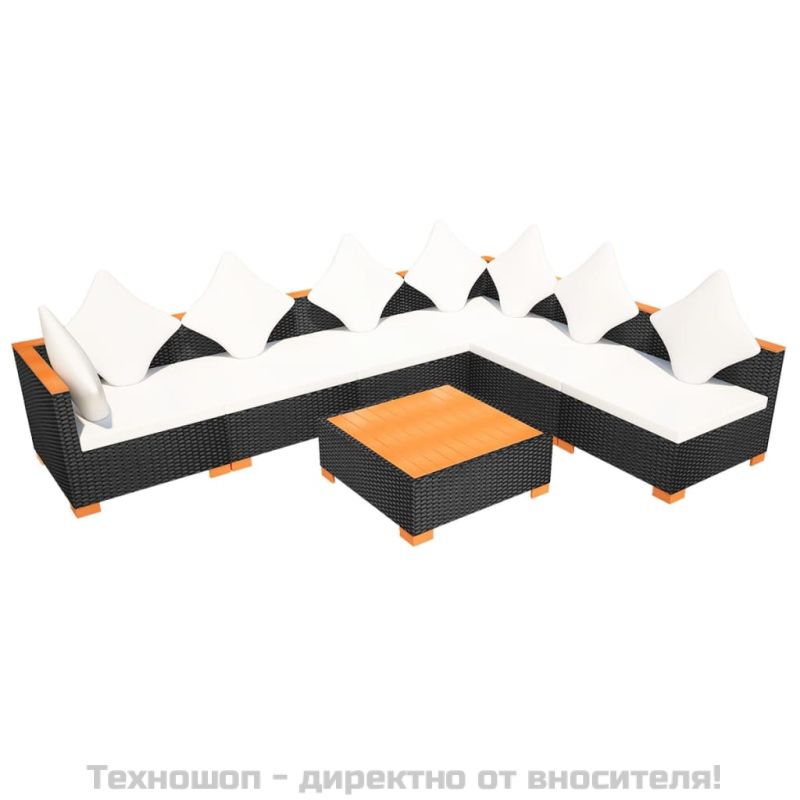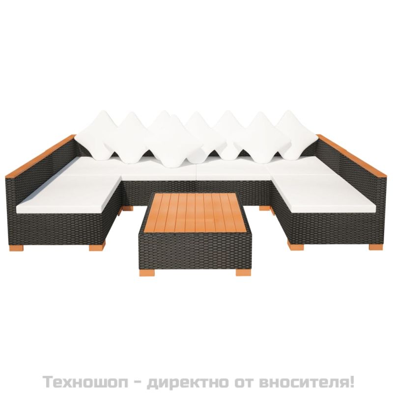 Градински комплект с възглавници, 7 части, черен полиратан