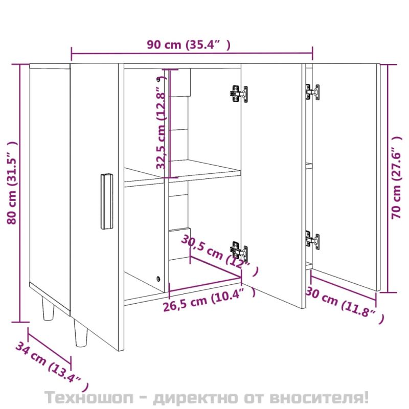 Този класически бюфет е предназначен да направи декоративно и практично допълнение към вашия дом. Първокласен материал: Инженерната дървесина е с изключително качество с гладка повърхност и също така се отличава със здравина, стабилност и устойчивост на влага.Просторно място за съхранение: Страничният шкаф има 3 врати, предоставяйки достатъчно място за съхранение, където да държите различни ваши вещи добре организирани и леснодостъпни. Горната част на този шкаф е чудесна за излагане на декоративни предмети.Лесно почистване: Този шкаф за съхранение се почиства лесно с влажна кърпа.Стилен дизайн: Този бюфет се отличава със стилен дизайн, който ще внесе излъчване на уникален чар в настоящия ви декор! Внимание:За да се предотврати преобръщане, този продукт трябва да се използва с предоставената приставка за стена.