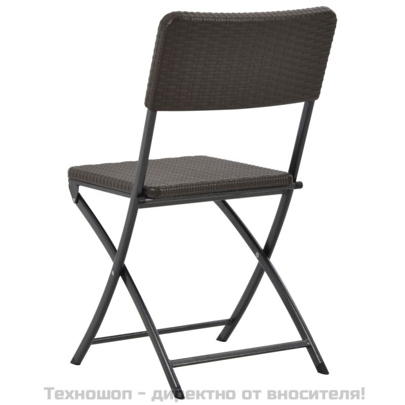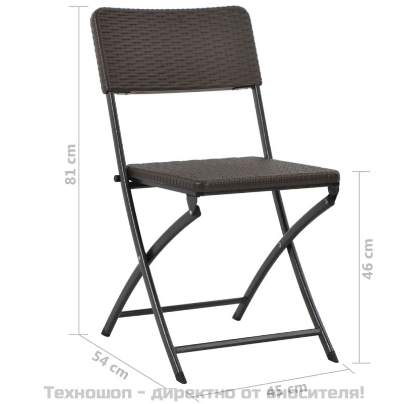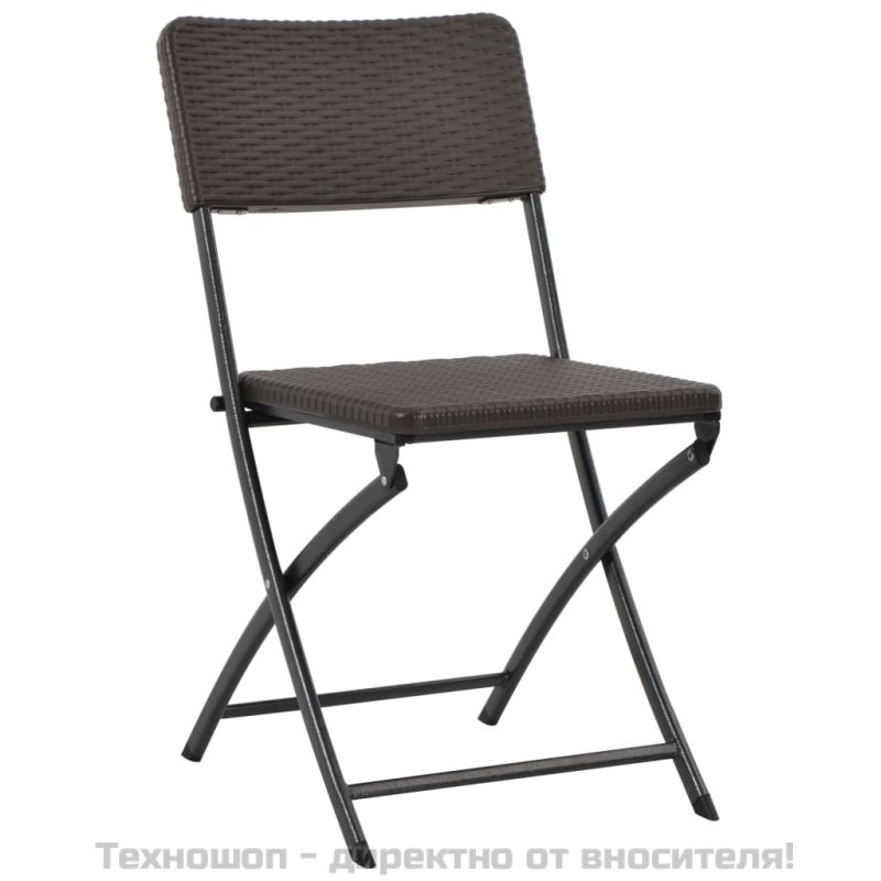 Този комплект от 2 сгъваеми стола е идеалното място за отдих и любуване на слънцето в градината или вътрешния двор. Със своята здрава стоманена рамка, комплектът столове е много издръжлив и стабилен. Благодарение на устойчивия на атмосферни влияния HDPE, столовете се почистват лесно и са подходящи за употреба на открито. Седалката и облегалката са с наподобяващ ратан дизайн, което допълва стилния вид на комплекта. Столовете са леки и лесни за местене. Комплектът може да се сгъва, когато не се използва, за да пести място. Доставката включва 2 сгъваеми стола. Забележка: Комплектът се доставя сглобен; не се изисква сглобяване. Максимално 110 кг на седалка.