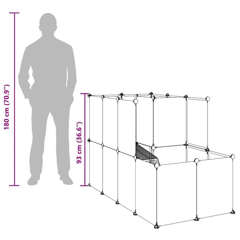 Тази клетка за дребни животни осигурява просторно и безопасно затворено пространство за движение, игра и почивка на вашите домашни любимци. Практичен материал: Къщичката за животни е изработен от PP пластмасови панели, които са водоустойчиви и се нуждаят от малко поддръжка.Здрава и стабилна структура: Стоманените рамки осигуряват здравина и стабилност.Просторна клетка: Къщичката за домашни любимци разполага с платформа и стълба, където вашите малки приятели да си почиват и играят, като същевременно остават в безопасност в рамките на ограждението.Удобен за потребителя дизайн: Клетката за животни може да се сглоби удобно с включения дървен чук. Когато не се използва, е лесно да отделите панелите и да ги подредите един върху друг, за да спестите място.Подходяща за малки животни: Тази ограда за домашни любимци предлага отлично място за игра на малки животни като кученца, котенца, зайчета, таралежи, хамстери, морски свинчета и др. Забележка:Максималната статична товароносимост е 10 кг.
