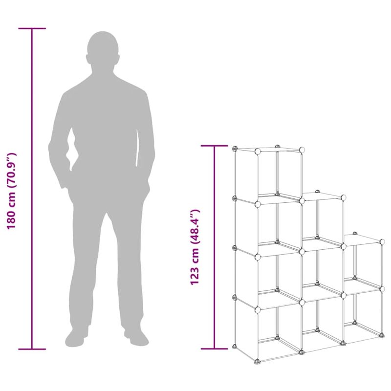 Този универсален органайзер с отделения във формата на куб е предназначен да използва по най-добрия начин ограниченото пространство и да задоволи различните ви нужди за съхранение. Практичен материал: Органайзерът за съхранение е изработен от PP пластмасови панели, които са водоустойчиви и се нуждаят от малко поддръжка.Здрава и стабилна структура: Стоманените рамки осигуряват здравина и стабилност.Дизайн, удобен за употреба: Благодарение на олекотения дизайн, рафтът за съхранение може да се сглоби по ваш вкус с включения дървен чук. Когато не се използва, е лесно да отделите панелите и да ги подредите един върху друг, за да спестите място.Достатъчно място за съхранение: Този пластмасов шкаф съдържа 9 модулни кубчета. Мястото за съхранение улеснява подреждането на вещите.Широко приложение: С голямо пространство за съхранение и семпъл дизайн, стелажът за съхранение е отлично решение за съхранение за вашия дом, общежитие и офис. Забележка:Максималната товароносимост на всеки куб е 10 кг.