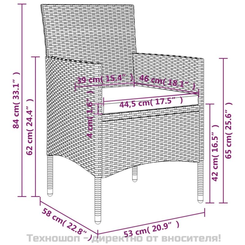 Този градински трапезен комплект с елегантен и съвременен дизайн е чудесен избор за хранене или почивка в градината. Устойчив на атмосферни влияния материал: Изработен от устойчив на атмосферни влияния и вода PE ратан, този градински трапезен комплект е лесен за почистване, издръжлив и подходящ за ежедневна употреба.Здрава рамка: Прахово боядисаните стоманени рамки правят комплекта за хранене на открито здрав и стабилен за ежедневна употреба на открито.Практичен плот: Гладкият плот на трапезната маса е изработен от закалено стъкло, което се почиства лесно с влажна кърпа. В допълнение, здравият плот е идеален за поставяне на ястия, напитки и други декоративни елементи.Удобен дизайн: Проектирани с извити облегалки и подлакътници, тези външни столове осигуряват максимален комфорт.Допълнителен комфорт: Дебело подплатените възглавници осигуряват максимален комфорт по време на седене. Забележка:Забележка: За да удължите живота на вашите градински мебели, ви препоръчваме да ги защитите с водоустойчиво покривало.Всеки продукт се доставя с ръководство за сглобяване в кашона за лесно сглобяване.