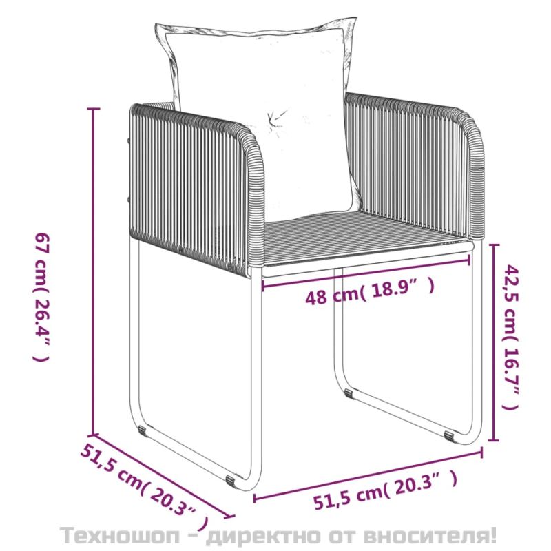 Създайте завладяваща и сплотена естетика във вашето външно пространство с този градински трапезен комплект! Устойчив на атмосферни влияния материал: Изработен от устойчив на атмосферни влияния и вода PE ратан, този градински трапезен комплект е лесен за почистване, издръжлив и подходящ за ежедневна употреба.Здрава рамка: Прахово боядисаните стоманени рамки правят комплекта за хранене на открито здрав и стабилен за ежедневна употреба на открито.Практичен плот: Гладкият плот на трапезната маса е изработен от закалено стъкло, което се почиства лесно с влажна кърпа. В допълнение, здравият плот е идеален за поставяне на ястия, напитки и други декоративни елементи.Допълнителен комфорт: Дебело подплатените възглавници осигуряват максимален комфорт по време на седене. Забележка:Забележка: За да удължите живота на вашите градински мебели, ви препоръчваме да ги защитите с водоустойчиво покривало.Всеки продукт се доставя с ръководство за сглобяване в кашона за лесно сглобяване.