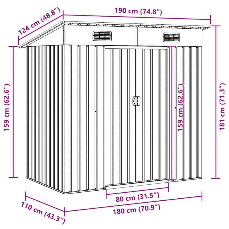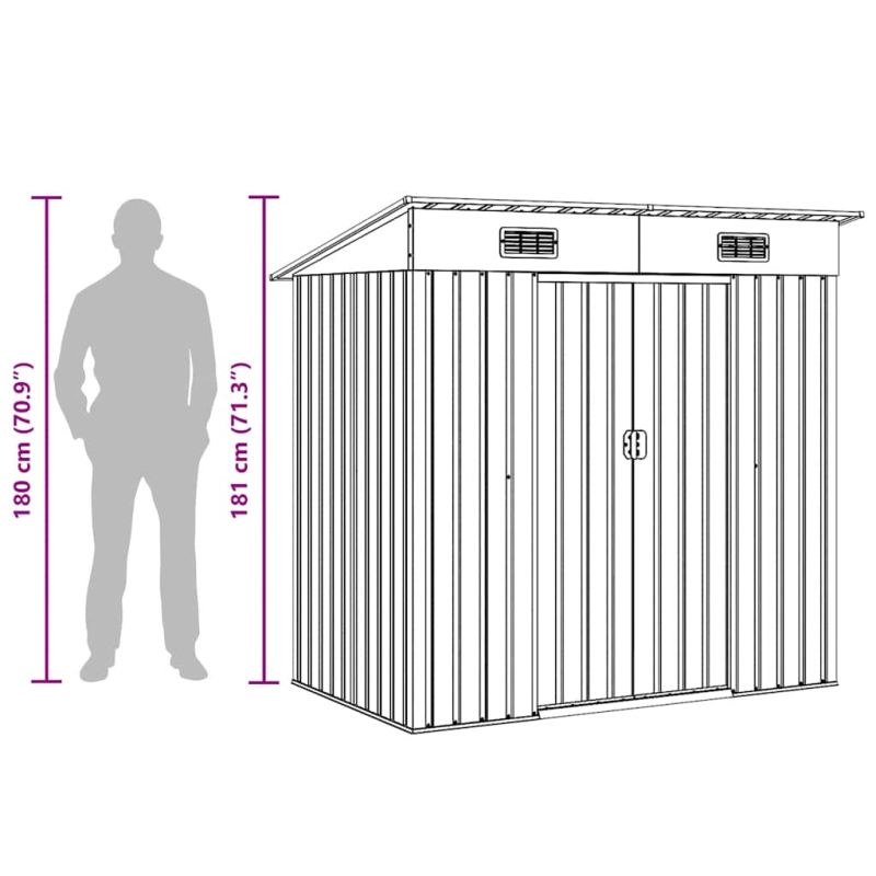 Този метален навес за съхранение ще бъде чудесно допълнение към всеки заден двор, морава или градина. Той е идеален за съхранение на градински инструменти, оборудване за грижа за тревата, домакински предмети и много други! Практичен дизайн: Този навес за съхранение има 2 вентилационни отвора отпред, което осигурява отлична вентилация. Двойните плъзгащи се врати отпред позволяват лесно влизане и излизане.Издръжлив материал: Поцинкованата стоманена конструкция, заедно с поцинковано покритие, го прави издръжлив и здрав, така че няма да корозира или да бъде засегнат от екстремни метеорологични условия.Лесен за сглобяване: Предварително изрязаните, предварително пробити части и включеното ръководство за употреба осигуряват бърз и лесен монтаж.Полезно е да знаете:За да предотвратите повреди от обилно натрупване на сняг, препоръчваме редовно да почиствате покрива през зимата.