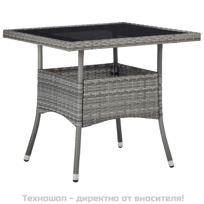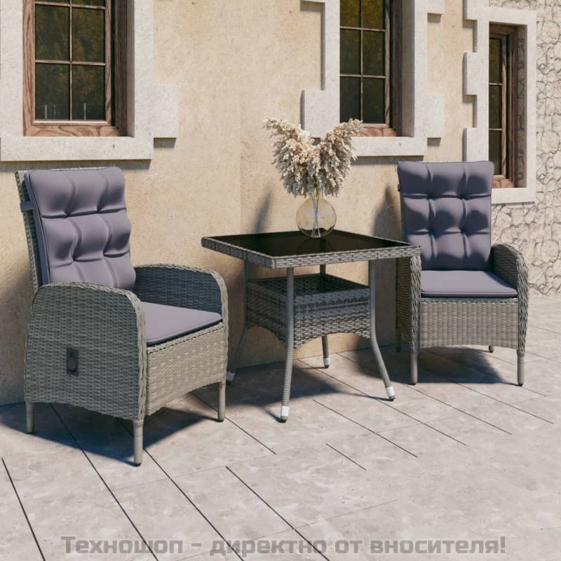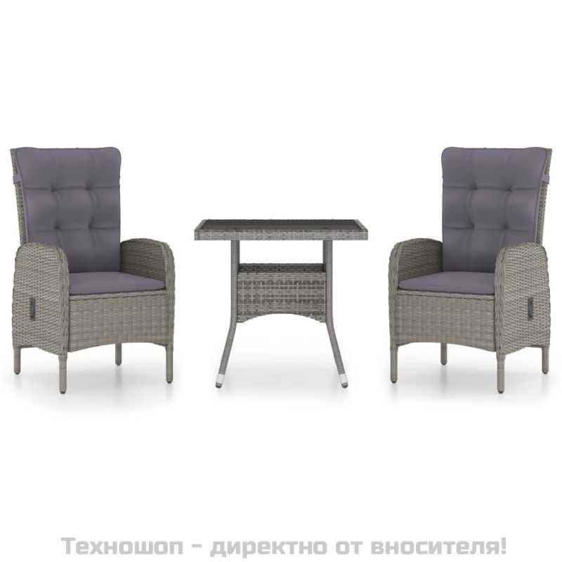 Градински трапезен комплект, 3 части, полиратан и стъкло, сив