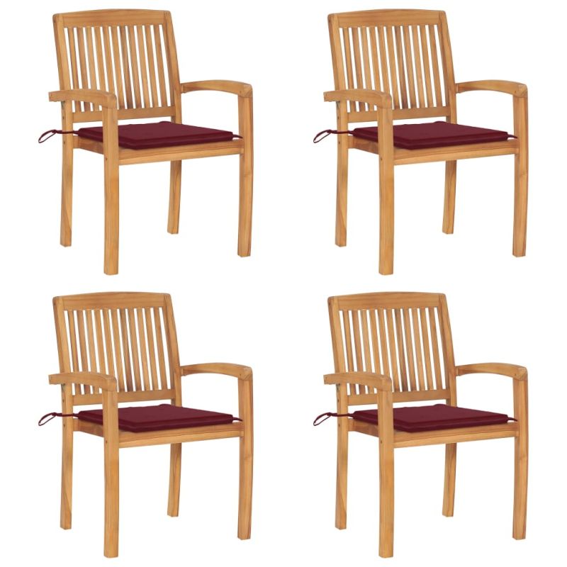 Добавете щрих на рустик чар към вашата трапезария, градина или вътрешен двор с този комплект стифиращи градински столове с възглавници! Този комплект трапезни столове ще извиси вашето вътрешно или външно жилищно пространство със своя елегантен ламелен дизайн. Комплектът мебели от тик е изработен от изключително издръжлива тикова твърда дървесина, която е суха – изсушена в пещ и фино шлифована, за да ѝ се придаде много гладък вид. Тиковото дърво е известно с изключителната си здравина и устойчивост на атмосферни влияния, което го прави далеч по-подходящо за градински мебели от всеки друг вид дърво. Тиковата дървесина е идеалният избор, ако искате да закупите дълготрайна градинска мебел. Лесно се поддържа и почиства с влажна кърпа. Освен това трапезните столове се подреждат един върху друг, за да се пести място за съхранение, когато не се използват. Нещо повече, включените възглавници осигуряват допълнителен комфорт. Всяка възглавница има 2 комплекта връзки, за да я фиксирате плътно към стола. Забележка: За да удължите живота на вашите градински мебели, препоръчваме ви да ги почиствате редовно и да не ги оставяте ненужно на открито без защита.Почистване: Използвайте мек сапунен разтворСъхранение: Ако е възможно, съхранявайте на хладно и сухо място на закрито. Ако продуктът се съхранява на открито, защитете го с водоустойчиво покривало. Избършете и изсушете излишната вода или сняг от плоските повърхности след дъжд или снеговалеж. Позволете достатъчно циркулация на въздуха, за да избегнете повреди, свързани с влагата. Максимално 110 кг на седалка.