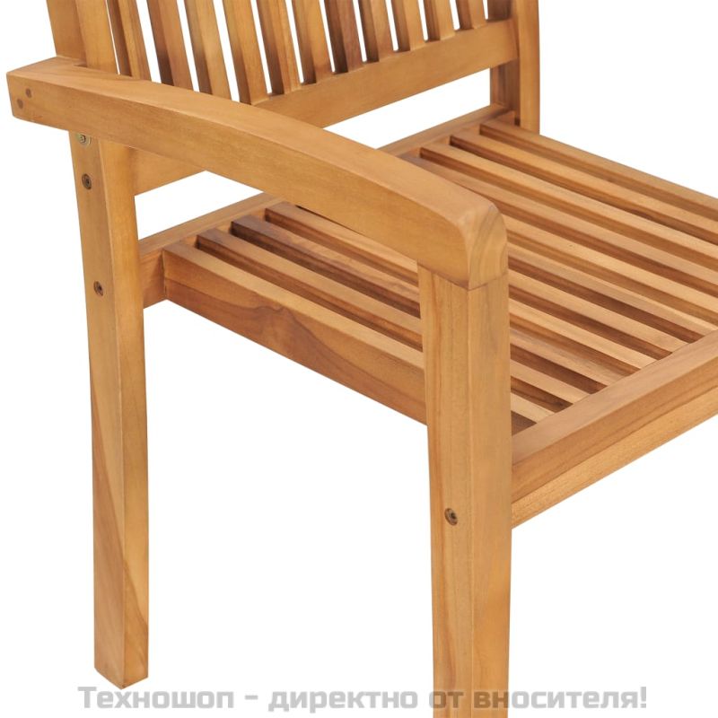 Добавете щрих на рустик чар към вашата трапезария, градина или вътрешен двор с този комплект стифиращи градински столове с възглавници! Този комплект трапезни столове ще извиси вашето вътрешно или външно жилищно пространство със своя елегантен ламелен дизайн. Комплектът мебели от тик е изработен от изключително издръжлива тикова твърда дървесина, която е суха – изсушена в пещ и фино шлифована, за да ѝ се придаде много гладък вид. Тиковото дърво е известно с изключителната си здравина и устойчивост на атмосферни влияния, което го прави далеч по-подходящо за градински мебели от всеки друг вид дърво. Тиковата дървесина е идеалният избор, ако искате да закупите дълготрайна градинска мебел. Лесно се поддържа и почиства с влажна кърпа. Освен това трапезните столове се подреждат един върху друг, за да се пести място за съхранение, когато не се използват. Нещо повече, включените възглавници осигуряват допълнителен комфорт. Всяка възглавница има 2 комплекта връзки, за да я фиксирате плътно към стола. Забележка: За да удължите живота на вашите градински мебели, препоръчваме ви да ги почиствате редовно и да не ги оставяте ненужно на открито без защита.Почистване: Използвайте мек сапунен разтворСъхранение: Ако е възможно, съхранявайте на хладно и сухо място на закрито. Ако продуктът се съхранява на открито, защитете го с водоустойчиво покривало. Избършете и изсушете излишната вода или сняг от плоските повърхности след дъжд или снеговалеж. Позволете достатъчно циркулация на въздуха, за да избегнете повреди, свързани с влагата. Максимално 110 кг на седалка.