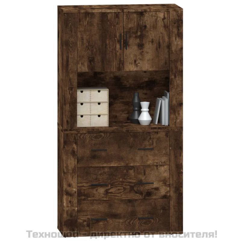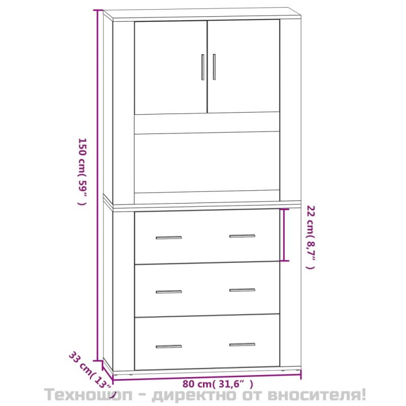 Търсите стилен висок шкаф? Този висок шкаф добавя уникален чар към вашия интериор! Издържлив материал: Инженерната дървесина е с изключително качество с гладка повърхност и се отличава със здравина, стабилност и устойчивост на влага.Достатъчно място за съхранение: Сайдбордът предоставя достатъчно място за съхранение, където да държите различни ваши вещи добре организирани и леснодостъпни.Функция за монтиране на стена: Шкафът за съхранение може да се монтира на стената в горната част на бюфета, за да се създаде висок шкаф, което спестява място на пода. По този начин можете да увеличите максимално пространството на пода и да поддържате ред и чистота. Добре е да се знае:За да бъде сглобяването възможно най-лесно, всеки продукт се доставя с ръководство.Винтовете и дюбелите за вътрешната стена не са включени. Съветваме ви да намерите и използвате винтове и дюбели, подходящи специално за вашите стени. Ако не сте сигурни, можете да се консултирате с професионалист. Моля, прочетете и следвайте всяка стъпка от инструкциите. Внимание:За предотвратяване на преобръщане този продукт трябва да се използва с предоставения анкер за стена.