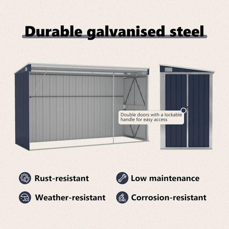 Този стенен градински навес е идеален за съхранение на различни предмети като инструменти, градински мебели, градинско оборудване и др. Навесът предлага защита от мръсотия, прах, както и от силен вятър и атмосферни влияния. Тъй като е изработен от поцинкована стомана и метал, складът изисква минимална поддръжка и е много издръжлив. Двойно отварящите се врати отпред позволяват лесно влизане и излизане. Пластмасовата дръжка с функция за заключване гарантира безопасността на вашите вещи. Освен това, дъждовната вода се оттича автоматично от покрива благодарение на наклонения си дизайн. Полезно е да знаете:За да предотвратите повреди от обилно натрупване на сняг, препоръчваме редовно почистване на покрива през зимата.