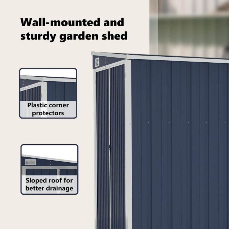 Този стенен градински навес е идеален за съхранение на различни предмети като инструменти, градински мебели, градинско оборудване и др. Навесът предлага защита от мръсотия, прах, както и от силен вятър и атмосферни влияния. Тъй като е изработен от поцинкована стомана и метал, складът изисква минимална поддръжка и е много издръжлив. Двойно отварящите се врати отпред позволяват лесно влизане и излизане. Пластмасовата дръжка с функция за заключване гарантира безопасността на вашите вещи. Освен това, дъждовната вода се оттича автоматично от покрива благодарение на наклонения си дизайн. Полезно е да знаете:За да предотвратите повреди от обилно натрупване на сняг, препоръчваме редовно почистване на покрива през зимата.