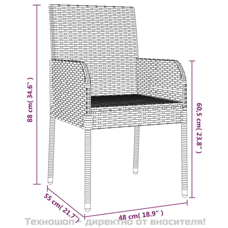 Този модерен градински трапезен комплект, отличаващ се с елегантен и съвременен дизайн, е чудесен избор за вечеря или почивка във вашата градина. Материал, устойчив на атмосферни влияния: PE ратан, известен също като полиратан, е устойчив на атмосферни влияния и лесен за почистване. Той остава красив отвън за дълъг период от време. Предлага отлично качество, удобство и естетичен вид.Здрава рамка: Прахово боядисаните стоманени рамки правят комплекта за хранене на открито здрав и стабилен за ежедневна употреба на открито.Практичен плот: Гладкият плот на градинската маса е изработен от закалено стъкло, което се почиства лесно с влажна кърпа. В допълнение, здравият плот е идеален за поставяне на ястия, напитки и други декоративни елементи.Модулен дизайн: Трапезният комплект за вътрешен двор е гъвкав и лесен за преместване, така че можете да го комбинирате с други модулни сегменти от уеб магазина, за да създадете ваши лични конфигурации на градински трапезни комплекти!Удобно седене: Облегалката добавя повече комфорт при седене на градинския стол. Освен това дебело подплатените възглавници осигуряват комфорт по време на седене. Добре е да се знае:За да бъде сглобяването възможно най-лесно, всеки продукт се доставя с ръководство. Забележка:За да сте сигурни, че вашите външни мебели ще останат красиви, ви препоръчваме да ги защитите с водоустойчиво покривало.
