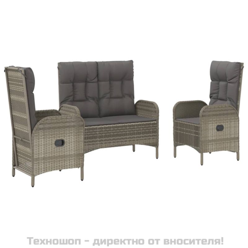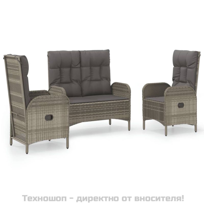 Градински трапезен комплект 3 части с възглавници сив полиратан