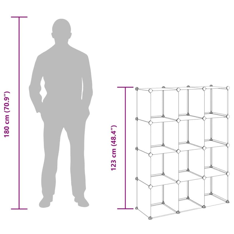 Този универсален органайзер с отделения във формата на куб е предназначен да използва по най-добрия начин ограниченото пространство и да задоволи различните ви нужди за съхранение. Практичен материал: Органайзерът за съхранение е изработен от PP пластмасови панели, които са водоустойчиви и се нуждаят от малко поддръжка.Здрава и стабилна структура: Стоманените рамки осигуряват здравина и стабилност.Дизайн, удобен за употреба: Благодарение на олекотения дизайн, рафтът за съхранение може да се сглоби по ваш вкус с включения дървен чук. Когато не се използва, е лесно да отделите панелите и да ги подредите един върху друг, за да спестите място.Достатъчно място за съхранение: Този пластмасов шкаф съдържа 12 модулни кубчета. Мястото за съхранение улеснява подреждането на вещите.Широко приложение: С голямо пространство за съхранение и семпъл дизайн, стелажът за съхранение е отлично решение за съхранение за вашия дом, общежитие и офис. Забележка:Максималната товароносимост на всеки куб е 10 кг.