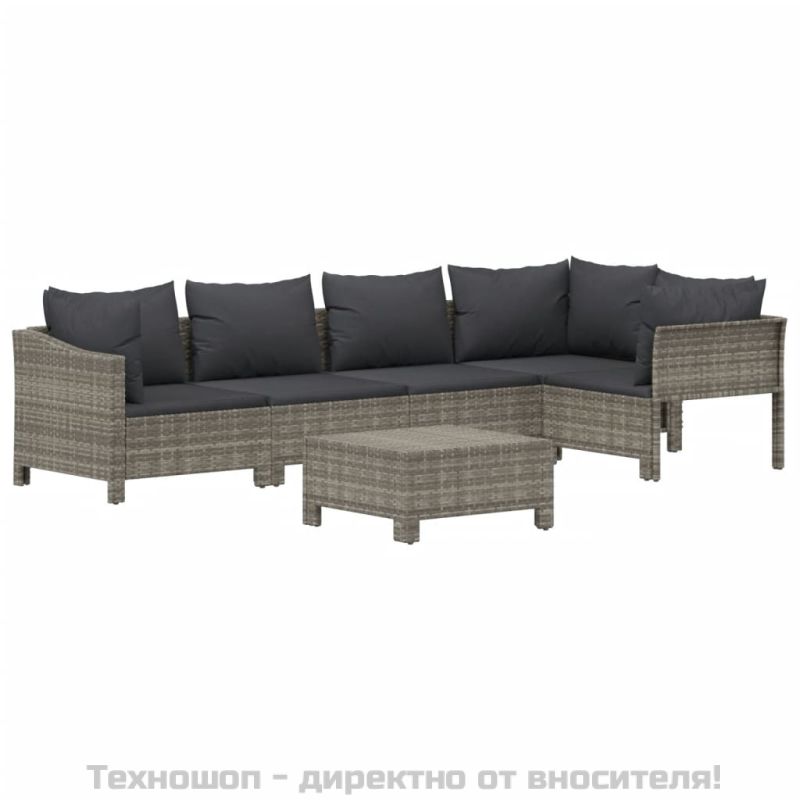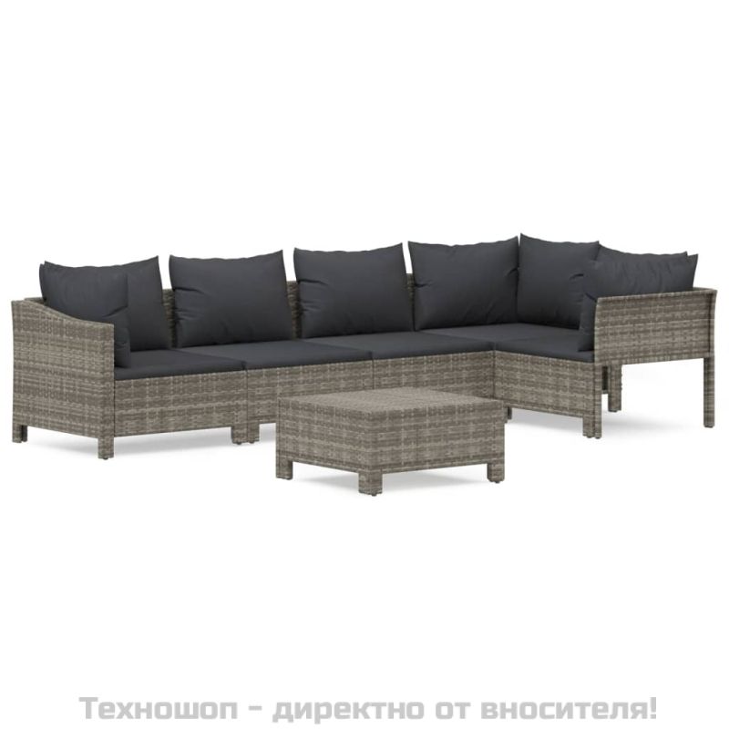 Градински комплект с възглавници, 6 части, полиратан, сив