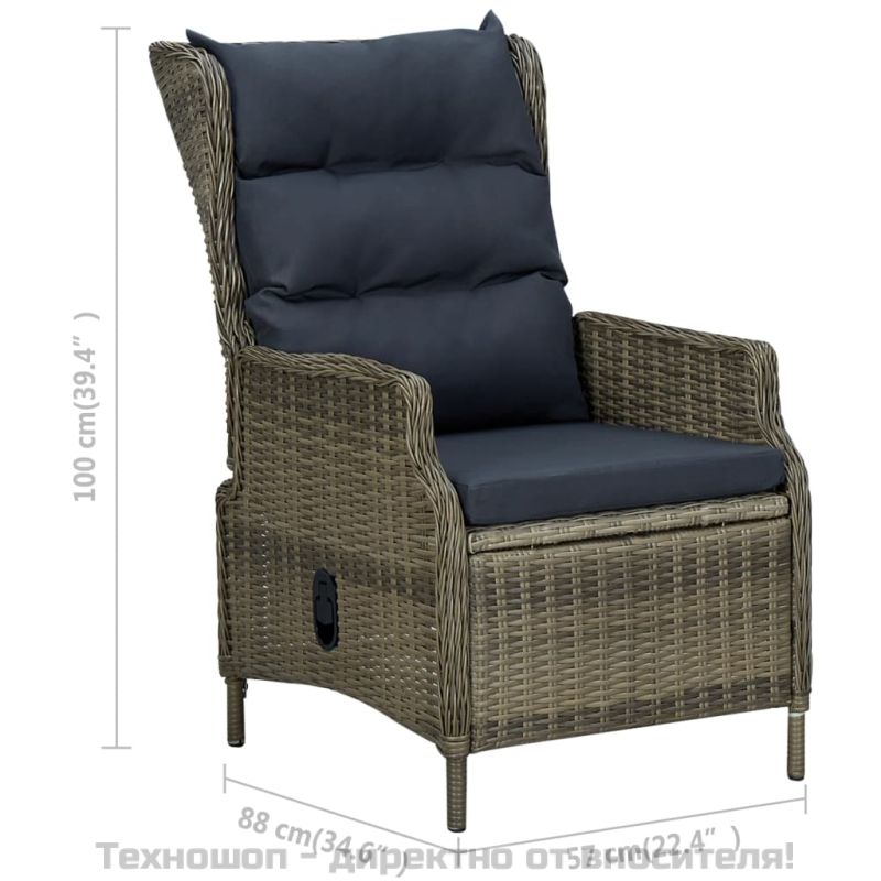 Този полиратанов градински лаундж комплект е отличен избор за разговори със семейството и приятелите или просто за наслаждаване на успокояващите слънчеви бани във вашето открито жилищно пространство. Градинските реклайнери и масичка за чай, разполагащи с прахово боядисана стоманена рамка, покрита с кръгъл РЕ ратан, са здрави и лесни за почистване. Плътно подплатените възглавници доставят допълнителен комфорт по времето на почивката ви. Калъфките на възглавниците, снабдени с цип, се свалят и перат. Благодарение на газовия повдигащ механизъм, облегалката също се регулира до най-удобната ви позиция. С натискане на страничния бутон можете да я свалите, за да се излегнете удобно. Столът е перфектен избор да се отпуснете и поставите краката си на поставката за крака, част от комплекта. Можете да го поставите на предпочитаното от вас място. При това масивният плот е идеален за поставяне или нареждане на различни ваши принадлежности. Лаундж комплектът е лесен за местене, благодарение на леката си конструкция. Важна забележка: Препоръчваме покриването на комплекта по време на дъжд, сняг и скреж с цел максимално продължителна употреба. Максимално 110 кг на седалка. Съобразете се с риска от открит огън и други източници на силна топлина в близост до продукта.