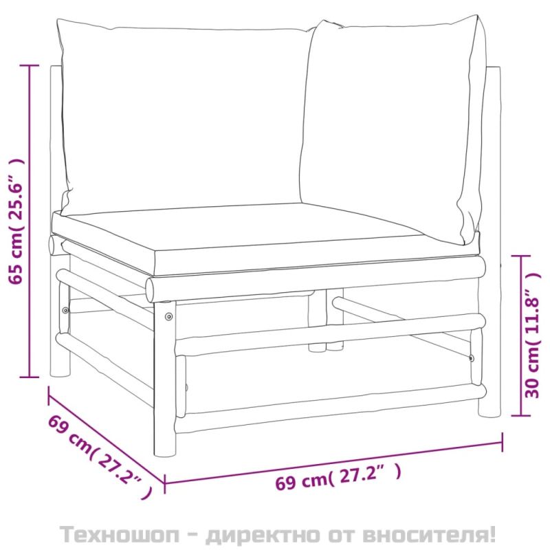 Насладете се на чаша кафе или чай при приятно време във вашето външно пространство с този елегантен бамбуков градински лаундж комплект! Издръжлив материал: Бамбукът е известен със своята гъвкавост и твърдост. Мебелите от бамбук са добър вариант, когато искате здрави външни мебели, изработени от естествени материали.Удобно седене: Облегалката и подлакътника добавят повече комфорт при седене на градинския комплект мека мебел. Освен това меките възглавници на седалката и облегалката осигуряват комфорт по време на седене.Практична маса: Здравата масичка е идеална за поставяне на ястия, напитки и други декоративни елементи.Модулен дизайн: Комплектът за отдих е гъвкав и лесен за преместване, така че можете да го комбинирате с други модулни сегменти в уеб магазина, за да създадете свои собствени лични конфигурации за отдих на открито! Забележка:За да сте сигурни, че вашите външни мебели ще останат красиви, ви препоръчваме да ги защитите с водоустойчиво покривало.Добре е да се знае:За да бъде сглобяването възможно най-лесно, всеки продукт се доставя с ръководство.
