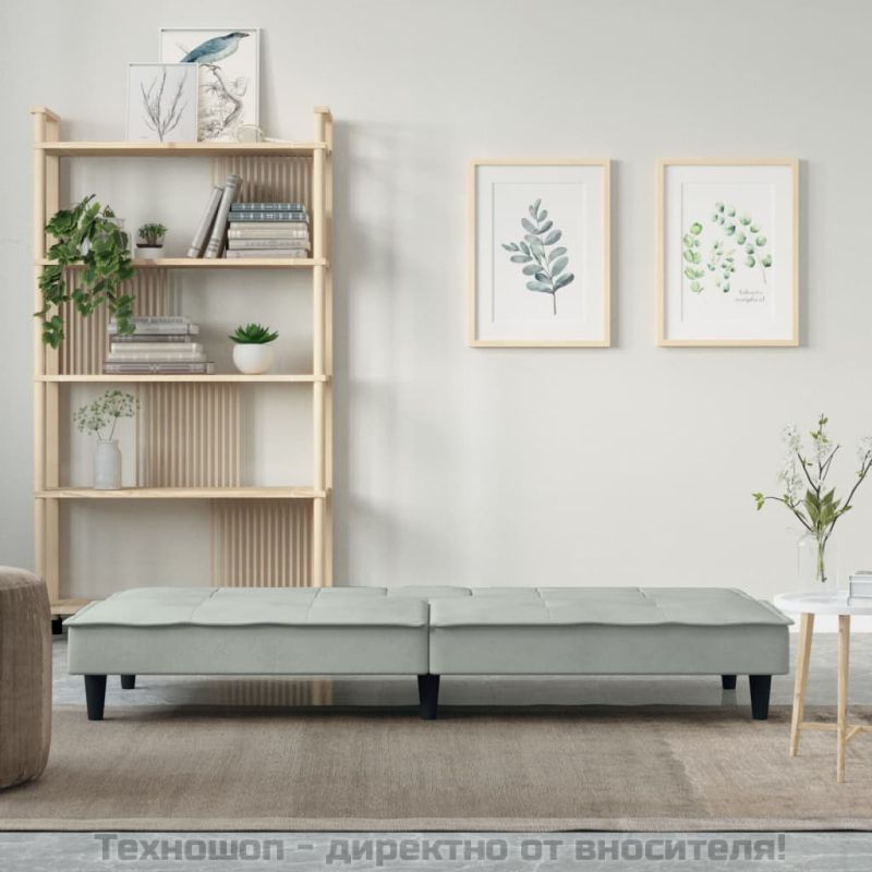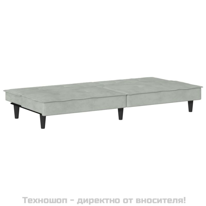 Разтегателен диван с поставки за чаши, светлосив, кадифе