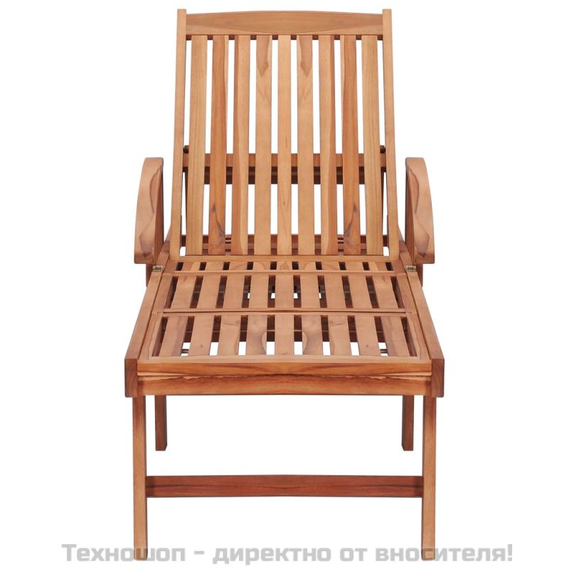 Класическият дървен шезлонг с атрактивен дизайн на летви добавя нотка рустик чар към вашата градина, вътрешен двор, тераса с басейн или всяко външно пространство. Тази мебел от тик е изработена от изключително издръжлива тикова твърда дървесина, която е суха – изсушена в пещ, а след това фино шлифована, за да ѝ се придаде много гладък вид. Тиковото дърво е известно с изключителната си здравина и устойчивост на атмосферни влияния, което го прави далеч по-подходящо за градински мебели от всеки друг вид дърво. Тиковата дървесина е идеалният избор, ако искате да закупите дълготрайна градинска мебел. Шезлонгът е снабден с 2 колелца, благодарение на които може лесно да се мести. Облегалката може да се регулира в 4 позиции – от седнало напълно изправено до напълно легнало положение. Ламелите на седалката и облегалката предлагат отлична опора и също така комфорт, а двата подлакътника осигуряват място за почивка на ръцете ви. В допълнение, включената възглавница е повече от практично допълнение; тя има и декоративна функция. Забележка: За да удължите живота на вашите градински мебели, ви препоръчваме да ги защитите с водоустойчиво покривало.