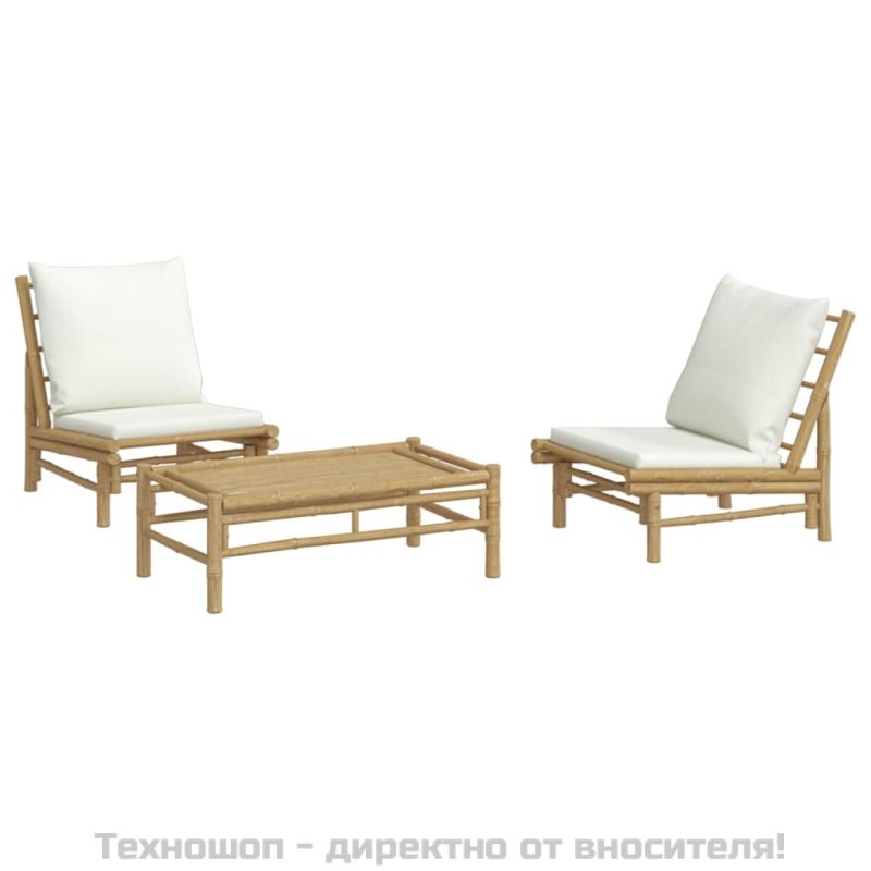 Градински лаундж комплект с кремави възглавници 3 части бамбук