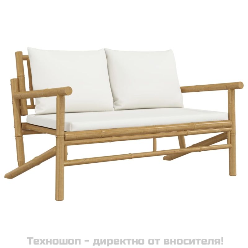 Градински лаундж комплект с кремави възглавници 5 части бамбук