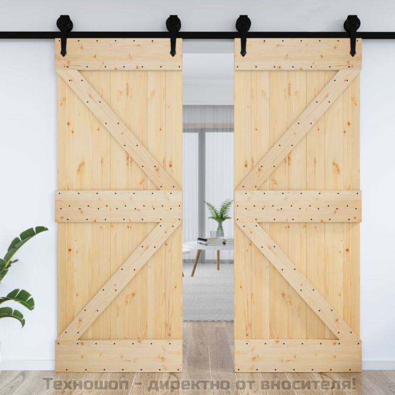 Тази врата от масивна борова дървесина е създадена, за да украси входа на дома ви и да го направи по-сигурен. Борово дърво масив: Интериорната врата е изработена от борово дърво масив. Масивната борова дървесина е красив естествен материал. Боровата дървесина е с продълговати шарки, а чеповете придават на материала характерния му рустик вид.Спестяващ място дизайн: Тази плъзгаща се врата спестява място и създава усещане за повече простор. Това е първият избор за семпъл и изпълнен с атмосфера модерен дизайн на дома. Широки приложения: Плъзгащата се врата може да се монтира както на дървени, така и на бетонни стени. Страхотна е за използване в спалнята, кухнята, плевнята, гаража и др. Добре е да се знае:За да допълните вашата врата NARVIK със забележителна релса за плъзгаща се врата, разгледайте нашата гама SKIEN. Уверете се, че размерът на релсата на плъзгащата се врата съответства на размера на вашата врата, преди да поръчате.