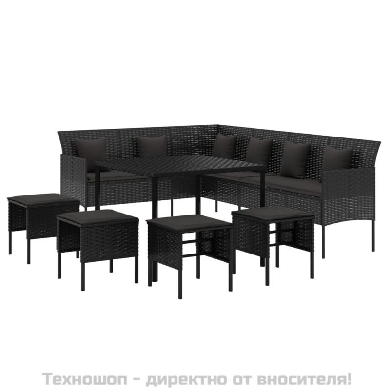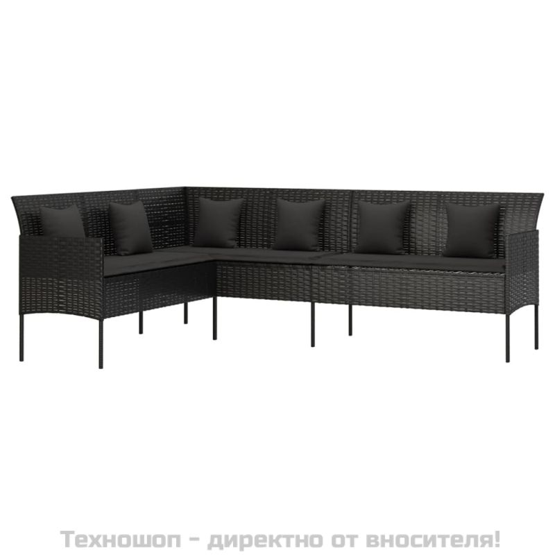 Градински комплект с възглавници, 6 части, черен, полиратан
