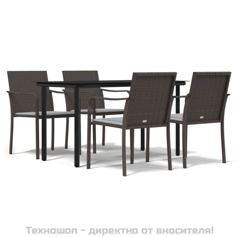 Този градински трапезен комплект, съчетаваща както стил, така и функционалност, без съмнение е предназначен да бъде акцентът на вашата градина, вътрешен двор или всяко друго жилищно пространство. Материал, устойчив на атмосферни влияния: PE ратан, известен също като полиратан, е устойчив на атмосферни влияния и лесен за почистване. Той остава красив отвън за дълъг период от време. Предлага отлично качество, удобство и естетичен вид.Здрава и стабилна рамка: Стоманените рамки правят трапезния комплект здрав и стабилен за ежедневна употреба на открито.Практичен плот: Гладкият плот на трапезната маса е изработен от закалено стъкло, което се почиства лесно с влажна кърпа. Освен това предлага отлична опора за съхранение на вашите ястия, напитки и други декоративни елементи.Удобни места за сядане: Столът за хранене е проектиран с облегалка, за да ви предложи удобно изживяване при сядане. Дебело подплатената възглавница на седалката осигурява максимален комфорт по време на седене. Забележка:За да сте сигурни, че вашите външни мебели ще останат красиви, ви препоръчваме да ги защитите с водоустойчиво покривало.