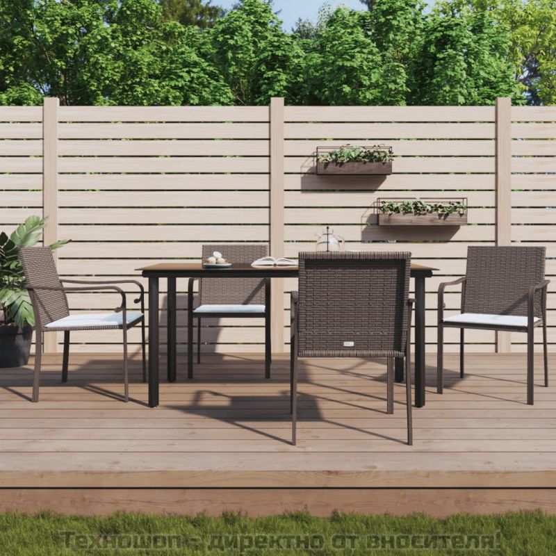 Този градински трапезен комплект, съчетаваща както стил, така и функционалност, без съмнение е предназначен да бъде акцентът на вашата градина, вътрешен двор или всяко друго жилищно пространство. Материал, устойчив на атмосферни влияния: PE ратан, известен също като полиратан, е устойчив на атмосферни влияния и лесен за почистване. Той остава красив отвън за дълъг период от време. Предлага отлично качество, удобство и естетичен вид.Здрава и стабилна рамка: Стоманените рамки правят трапезния комплект здрав и стабилен за ежедневна употреба на открито.Практичен плот: Гладкият плот на трапезната маса е изработен от закалено стъкло, което се почиства лесно с влажна кърпа. Освен това предлага отлична опора за съхранение на вашите ястия, напитки и други декоративни елементи.Удобни места за сядане: Столът за хранене е проектиран с облегалка, за да ви предложи удобно изживяване при сядане. Дебело подплатената възглавница на седалката осигурява максимален комфорт по време на седене. Забележка:За да сте сигурни, че вашите външни мебели ще останат красиви, ви препоръчваме да ги защитите с водоустойчиво покривало.