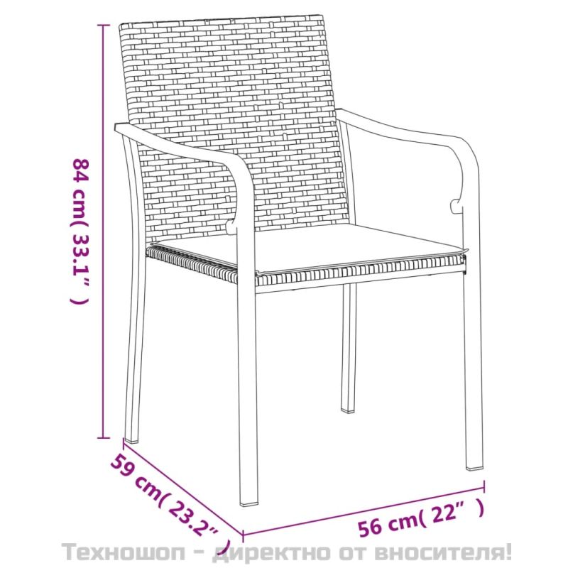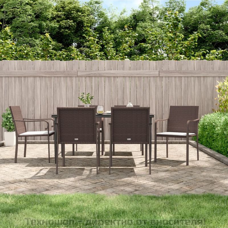 Този градински трапезен комплект, съчетаваща както стил, така и функционалност, без съмнение е предназначен да бъде акцентът на вашата градина, вътрешен двор или всяко друго жилищно пространство. Материал, устойчив на атмосферни влияния: PE ратан, известен също като полиратан, е устойчив на атмосферни влияния и лесен за почистване. Той остава красив отвън за дълъг период от време. Предлага отлично качество, удобство и естетичен вид.Здрава и стабилна рамка: Стоманените рамки правят трапезния комплект здрав и стабилен за ежедневна употреба на открито.Практичен плот: Гладкият плот на трапезната маса е изработен от закалено стъкло, което се почиства лесно с влажна кърпа. Освен това предлага отлична опора за съхранение на вашите ястия, напитки и други декоративни елементи.Удобни места за сядане: Столът за хранене е проектиран с облегалка, за да ви предложи удобно изживяване при сядане. Дебело подплатената възглавница на седалката осигурява максимален комфорт по време на седене. Забележка:За да сте сигурни, че вашите външни мебели ще останат красиви, ви препоръчваме да ги защитите с водоустойчиво покривало.