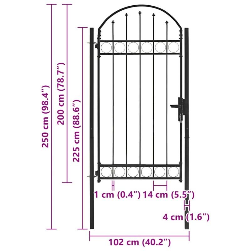 Тази оградна порта ще бъде практична, модерно стилизирана входна точка, която да отдели вашата градина от външния свят. Много стабилна и издръжлива, вратата ще формира практична защитна преграда за вашата градина, вътрешен двор или тераса. С елегантния си дизайн, арковидна горна част и здрави хоризонтални прътове за подсилване на рамката, нашата градинска врата ще осигури висока степен на сигурност, като същевременно ще създаде страхотен вход за вашия имот. Изработена от издръжлива стомана, портата е прахово боядисана за защита от ръжда и корозия. Тази градинска врата е чудесна комбинация от стил, здравина, стабилност и устойчивост на корозия!