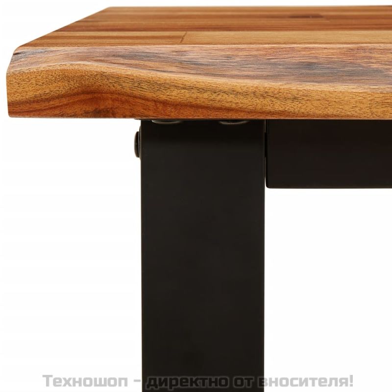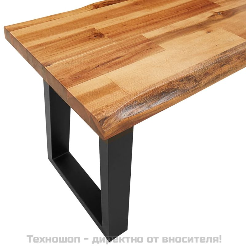 Отличаващ се с елегантен дизайн, този трапезен комплект ще се превърне във фокусна точка на вашата трапезария или кухня. Масивно акациево дърво: Пейката и трапезната маса са изработени от масивно акациево дърво. Масивното акациево дърво е красив естествен материал. Акациевото дърво е тропическа твърда дървесина, която е плътна, здрава и издръжлива.Жив ръб: Живият ръб на дървото, който следва естествената форма на дървото, увеличава красотата на комплекта мебели.Стабилна рамка: U-образните стоманени крака с прахово покритие добавят индустриален стил към вашия интериор, като същевременно гарантират стабилността на трапезния комплект.Практичен плот: Здравият плот на кухненската маса е идеален за поставяне на ястия, напитки и други декоративни елементи.
