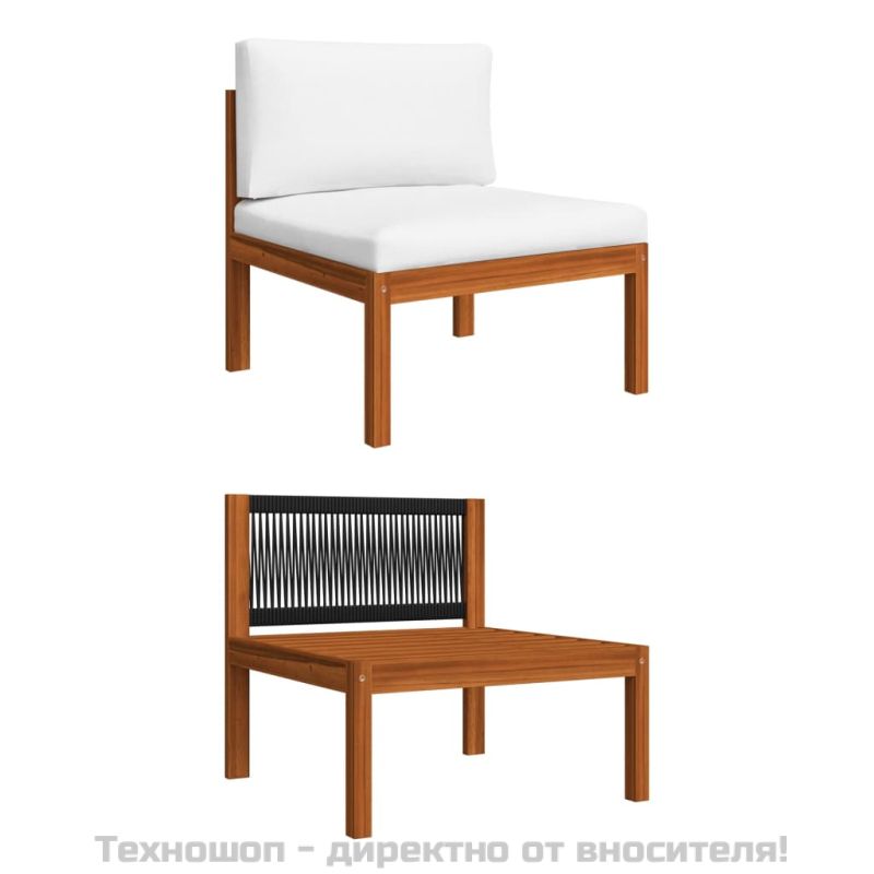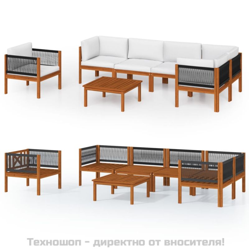 Този градински комплект за почивка с плетени от въжета облегалки ще бъде идеален избор за вас, за да се отпуснете и да се насладите на времето, да подремнете или да поговорите със семейството или приятелите си. С непреходен дизайн, дървеният комплект за почивка ще добави нотка рустик чар към вашата тераса, градина или хол. Градинският диван е с изработени от въжета облегалки, добавяйки изтънчен щрих към всяко външно пространство. Този градински комплект е изработен от висококачествена масивна акациева дървесина, тропическа твърда дървесина, която е устойчива на атмосферни влияния и е изключително издръжлива. Благодарение на масленото покритие, комплектът мебели за тераса има топъл цвят и е лесен за почистване и поддръжка. Освен това, доставката включва възглавници за седалката и облегалката с дебела подплата за максимален комфорт при почивка.