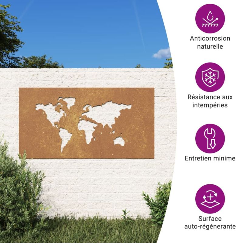 Превърнете празна стена или ограда в шедьовър с тази градинска стенна декорация. Издръжлив материал: Кортенова стомана, известна също като патинираща стомана. Тя е антикорозионна по своята същност. Развива ръждив защитен слой срещу корозия при първото излагане на атмосферни условия. Следователно не е необходимо да я боядисвате. Това може да ви помогне да спестите разходи за поддръжка и ремонт. Отличителният кафяв цвят на кортеновата стомана със сигурност ще привлече вниманието. И накрая, патиниращата стомана е изключително издръжлива и ще издържи изпитанието на времето.Изящен дизайн: Металната декорация за стена е с кух дизайн с модел на карта на света, което прави вашата градина по-атрактивна.Лесна инсталация: Външната стенна декорация се монтира лесно, благодарение на монтажните отвори на гърба. Добре е да се знае:Този продукт все още не е ръждясал и когато го получите ще има нормален метален цвят, но ръждата ще се появи с течение на времето. Можете да ускорите процеса на ръждясване, като го напръскате със сапунена и солена вода. За да запазите дрехите си от петна, избягвайте контакт с образуващия се слой ръжда.