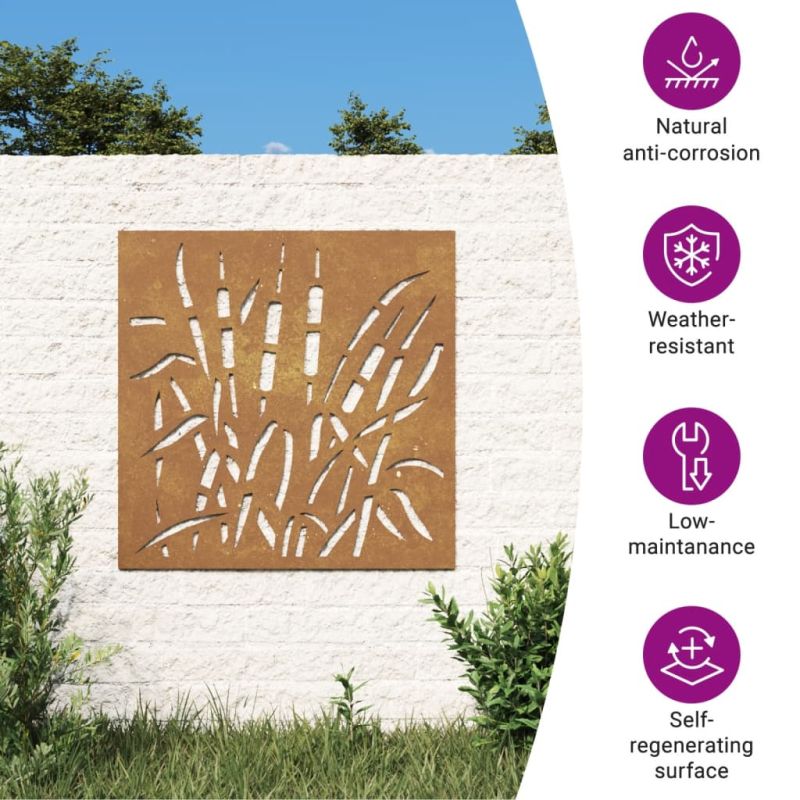 Превърнете празна стена или ограда в шедьовър с тази градинска стенна декорация. Издръжлив материал: Кортенова стомана, известна също като патинираща стомана. Тя е антикорозионна по своята същност. Развива ръждив защитен слой срещу корозия при първото излагане на атмосферни условия. Следователно не е необходимо да я боядисвате. Това може да ви помогне да спестите разходи за поддръжка и ремонт. Отличителният кафяв цвят на кортеновата стомана със сигурност ще привлече вниманието. И накрая, патиниращата стомана е изключително издръжлива и ще издържи изпитанието на времето.Изящен дизайн: Металната декорация за стена е с изрязан дизайн на треви и създава естествена атмосфера в градината ви.Лесна инсталация: Външната стенна декорация се монтира лесно, благодарение на монтажните отвори на гърба. Добре е да се знае:Този продукт все още не е ръждясал и когато го получите ще има нормален метален цвят, но ръждата ще се появи с течение на времето. Можете да ускорите процеса на ръждясване, като го напръскате със сапунена и солена вода. За да запазите дрехите си от петна, избягвайте контакт с образуващия се слой ръжда.