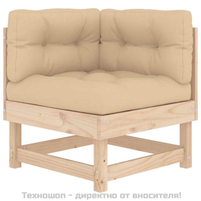 Този дървен градински лаундж комплект, който се отличава с дизайн на летви и меки възглавници, ще бъде чудесно допълнение към вашата градина, вътрешен двор или тераса, за да се насладите на уютно време със семейството или приятелите си. Масивна борова дървесина: Масивната борова дървесина е красив естествен материал. Боровата дървесина е с продълговати шарки, а чеповете придават на материала характерния му рустик вид.Здрава и стабилна рамка: Дървената рамка прави лаундж комплекта здрав и стабилен за ежедневна употреба на открито.Удобно седене: Облегалката и подлакътника добавят повече комфорт при седене на градинския комплект мебели. Освен това дебело подплатените възглавници осигуряват комфорт по време на седене.Модулен дизайн: Комплектът мебели е гъвкав и лесен за преместване. Можете да я комбинирате с други модулни сегменти в уеб магазина, за да създадете свои лични конфигурации на градински лаундж комплект! Добре е да се знае:За да сте сигурни, че вашите външни мебели ще останат красиви, ви препоръчваме да ги защитите с водоустойчиво покривало.